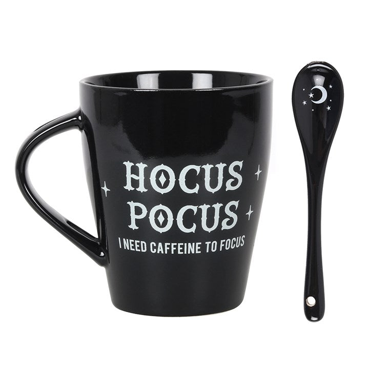 This bewitching mug and spoon set will add a pinch of magic to every cuppa. Style features 'Hocus Pocus, I Need Caffeine to Focus' text and matching teaspoon with a mystical moon and star design that fits perfectly in a slotted handle. 500ml capacity. Dishwasher and microwave safe.
