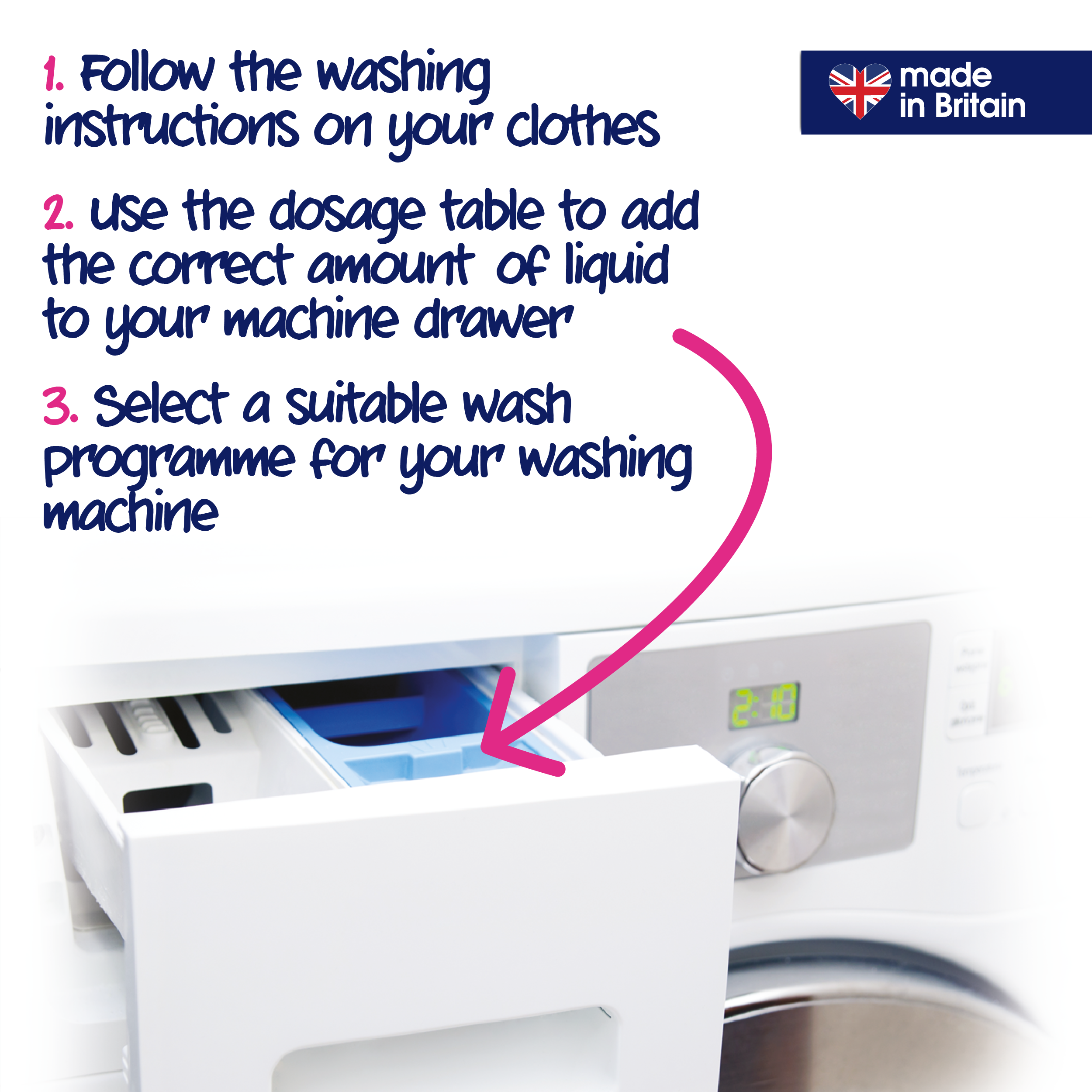 1) Follow the washing instructions on your clothes. 2) Follow the dosage chart on the back of pack and add the correct dosage to your machine drawer. 3) Select a suitable wash programme for your washing machine. Alternatively, use 40ml/1 cap of liquid to water to hand wash.