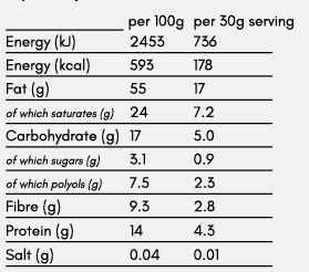 Coconut (26%), sunflower seeds (23%), almonds (13%), pumpkin seeds (10%), flaxseed (8%), sweetener: erythritol* & steviol glycosides**, hazelnuts (6%), coconut oil