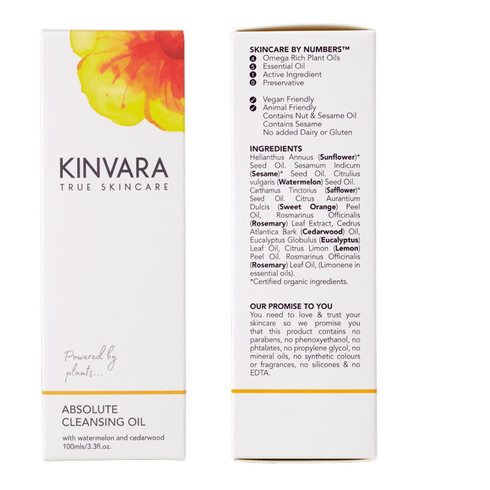 Kinvara Absolute Cleansing Oil is a hot cloth face cleanser made only from 100% plant oils that contains no harsh chemicals. It contains an innovative blend of skin loving plant oils to restore balance and cleanse your skin, gently and effectively.