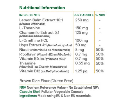 L-Theanine is a natural amino acid, found mainly in green tea. Lemon balm is an herb that has been found to encourage restful sleep, and can induce a sense of calm. Chamomile is often taken to support relaxation and works to aid a more restful sleep, while B Vitamins are key to maintaining the functioning of the nervous system.