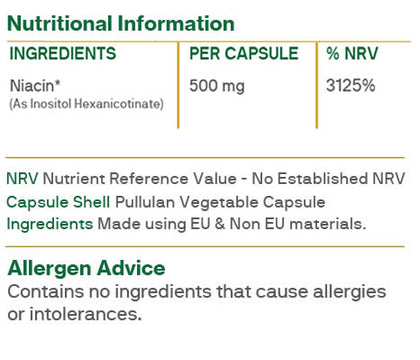 | Niacin (as Inositol Hexanicotinate) | 500mg | 3,125% |