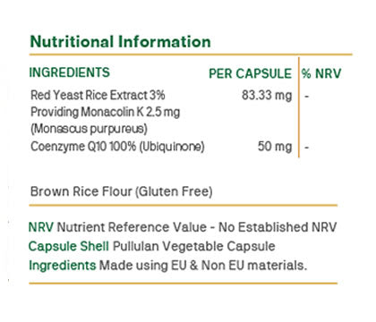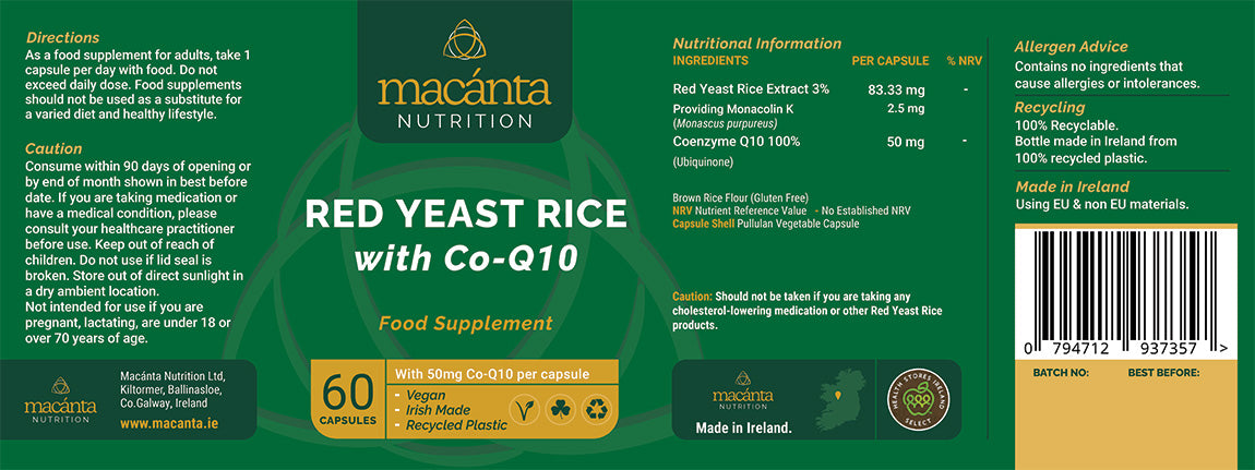Macánta Nutrition’s Red Yeast Rice +100mg CoQ10 has been formulated for healthy blood cholesterol. Each capsule provides 5mg of Monacolin K along with 100mg of Co-Enzyme Q10.