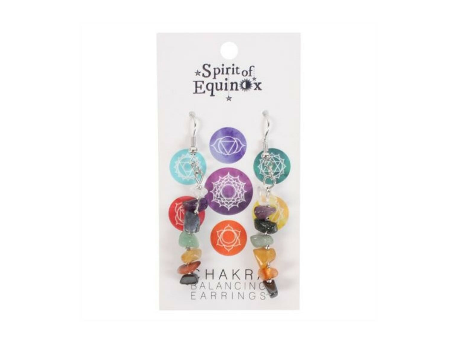 Spirit of Equinox Chakra Balancing Earrings. These beautiful Chakra earrings are made of up seven semi precious stones each representing the seven chakras. Presented on a designed display card. Chakra Jewellery is often recommended for people who use Reiki or practice Yoga to help enhance their spiritual and physical wellbeing.