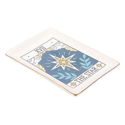 This tarot-inspired trinket dish is perfect for holding jewellery, keys, and small treasures. Featuring an elegant The Star design with gold edging, this dish will add a touch of mysticism to any desk, vanity or side table. Part of the Vintage Tarot collection of mystical gifts and home decor.