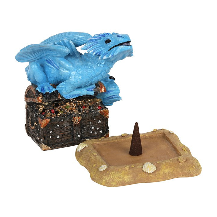 Designed by Anne Stokes , this eye-catching incense cone burner features a cute, blue dragon sitting on top of treasure chest. When an incense cone is lit and placed inside the smoke from the cone will flow through the open chest for an impressive feature piece.