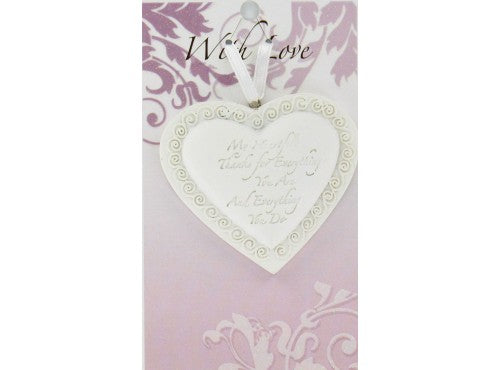 Beautiful hanging porcelain heart with an inspirational quote carved into it.